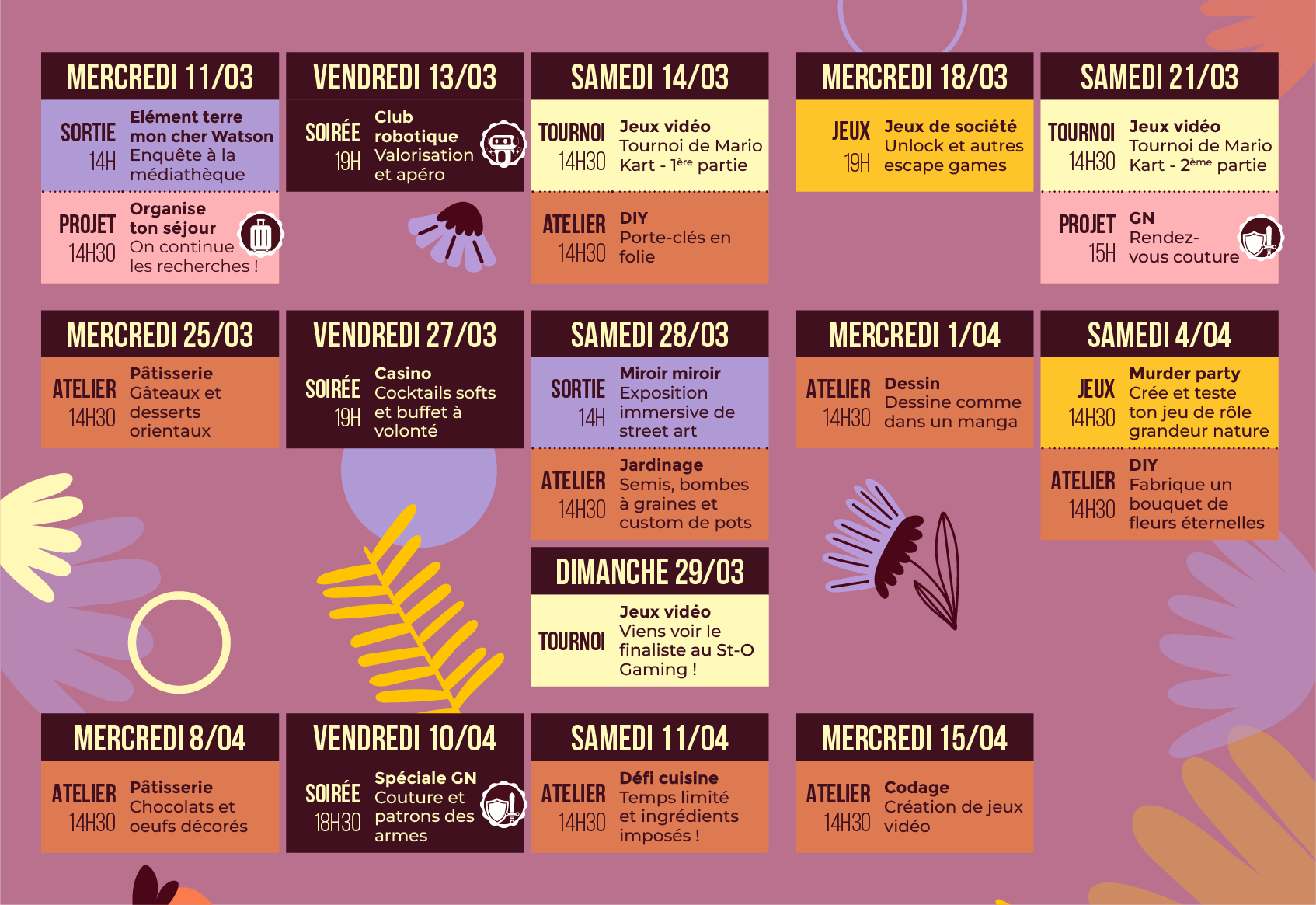 Du 11 mars au 15 avril, retrouvez-nous tous les mercredis et samedis après-midis, ainsi que les vendredis 13/03, 27/03 et 10/04 en soirée.