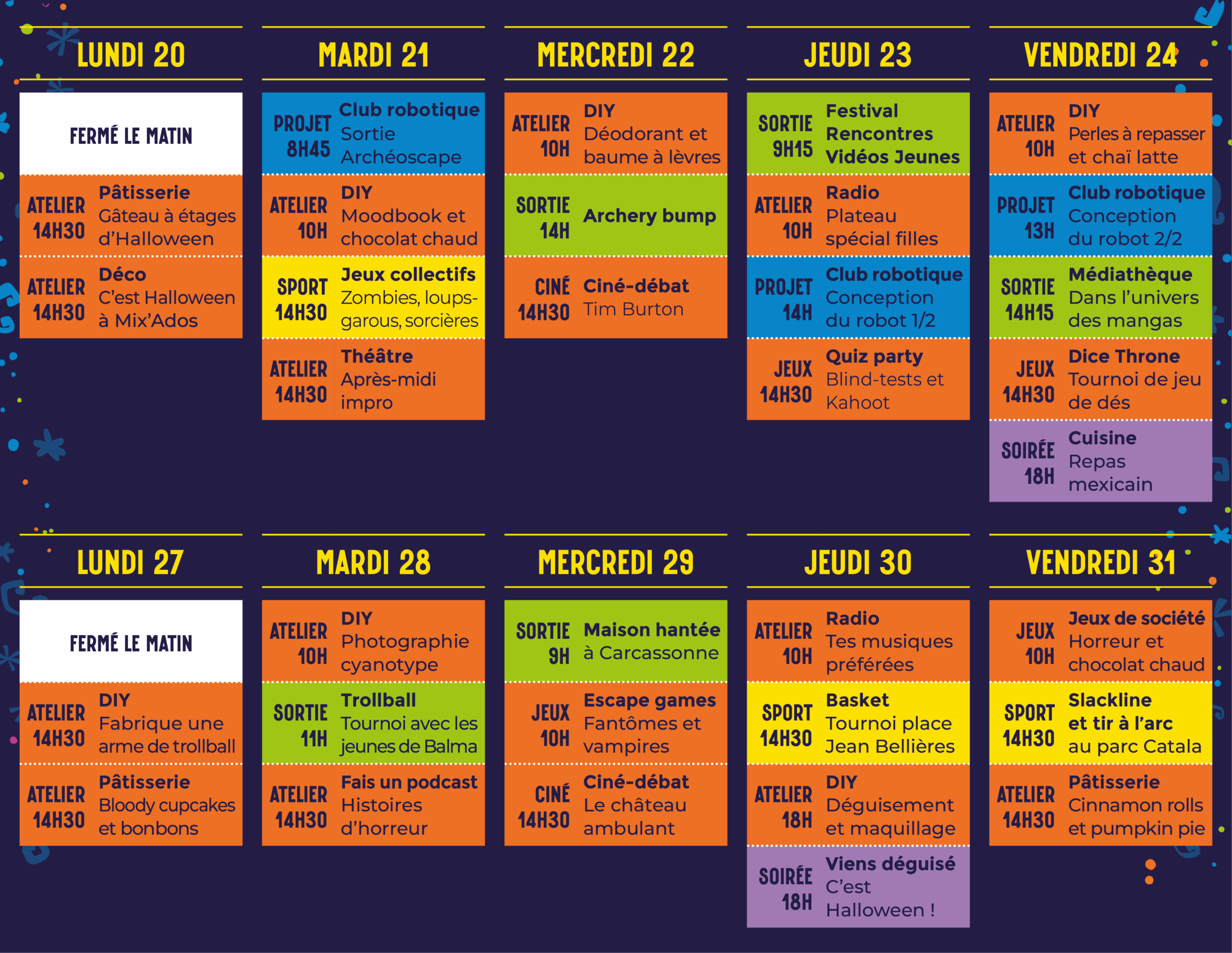 Du 20 au 31 octobre, retrouvez-nous tous les jours, du lundi au vendredi pour des ateliers, des sorties, des soirées et des projets.