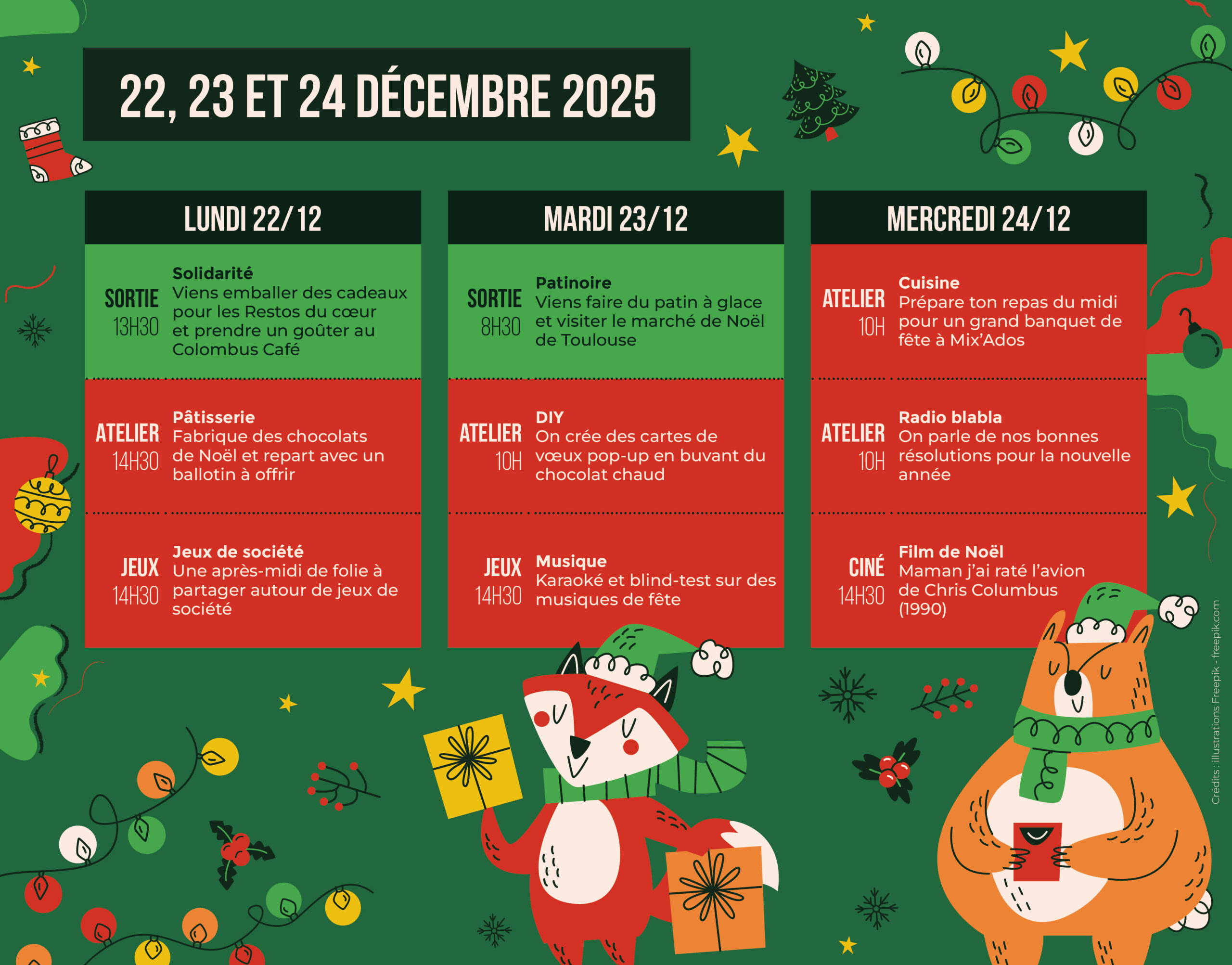 Les 22, 23 et 24 décembre, retrouvez-nous pour des ateliers, des jeux et des sorties.